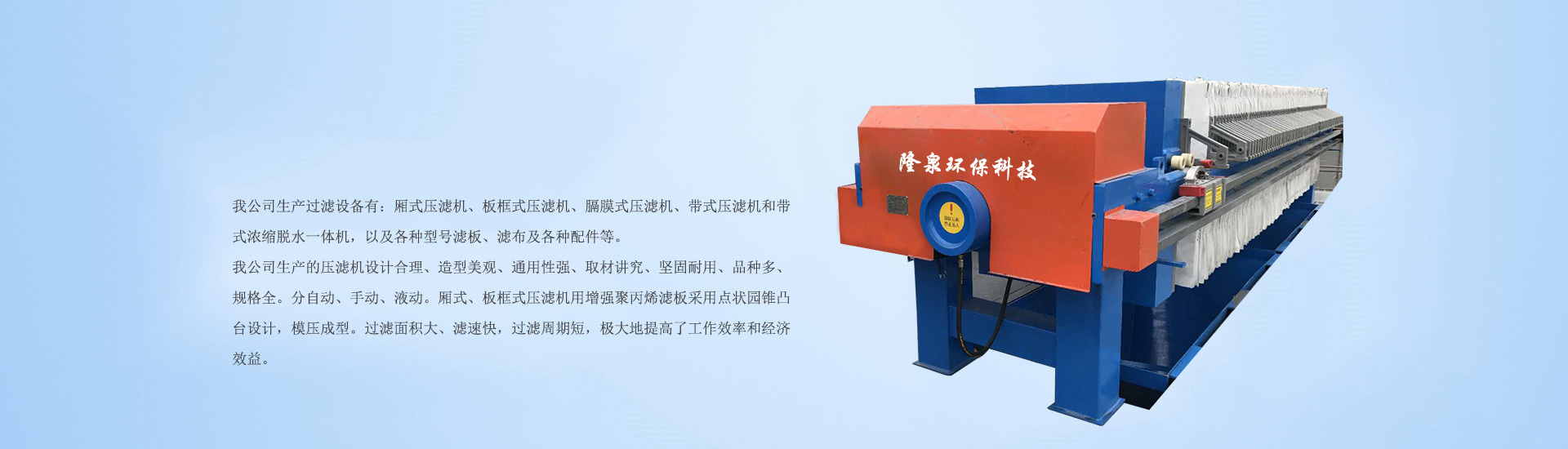 河南隆泉環(huán)保科技有限公司是一家具有自主設(shè)計(jì)開(kāi)發(fā)和生產(chǎn)制造能力并吸收 了國(guó)內(nèi)外優(yōu)秀同行廠(chǎng)家的產(chǎn)品優(yōu)點(diǎn)、加工廂式、板框式、隔膜式、帶式設(shè)備齊全、技術(shù)工藝先進(jìn)、 實(shí)力雄厚、新產(chǎn)品質(zhì)量?jī)?yōu)良的新型設(shè)備的專(zhuān)業(yè)生產(chǎn)公司。我公司生產(chǎn)的主導(dǎo)產(chǎn)品一一防腐型壓濾機(jī),設(shè)計(jì)合理、造型美觀(guān)、通用性強(qiáng)、取材講究、堅(jiān) 固耐用、品種多,規(guī)格齊全。產(chǎn)品分為:自動(dòng)、手動(dòng)、液動(dòng)、廂式、板框式、機(jī)、電液一體式和 機(jī)、電、液分體式壓濾機(jī),其中壓濾機(jī)濾板采用增強(qiáng)聚丙烯濾板,其過(guò)濾面采用點(diǎn)狀圓錐凸臺(tái)設(shè) 計(jì),模壓成型,過(guò)濾面積大,濾速快,過(guò)濾周期短,極大的提高了工作效率和經(jīng)濟(jì)效益。公司可 根據(jù)用戶(hù)需求,設(shè)計(jì)制造各種特殊性能的壓濾機(jī),配置具有抗腐性的各種聚丙烯托盤(pán)和流槽。為了適就市場(chǎng)需求,公司努力提高產(chǎn)品檔次,積極研究耐高溫、耐高腐蝕、耐高壓···